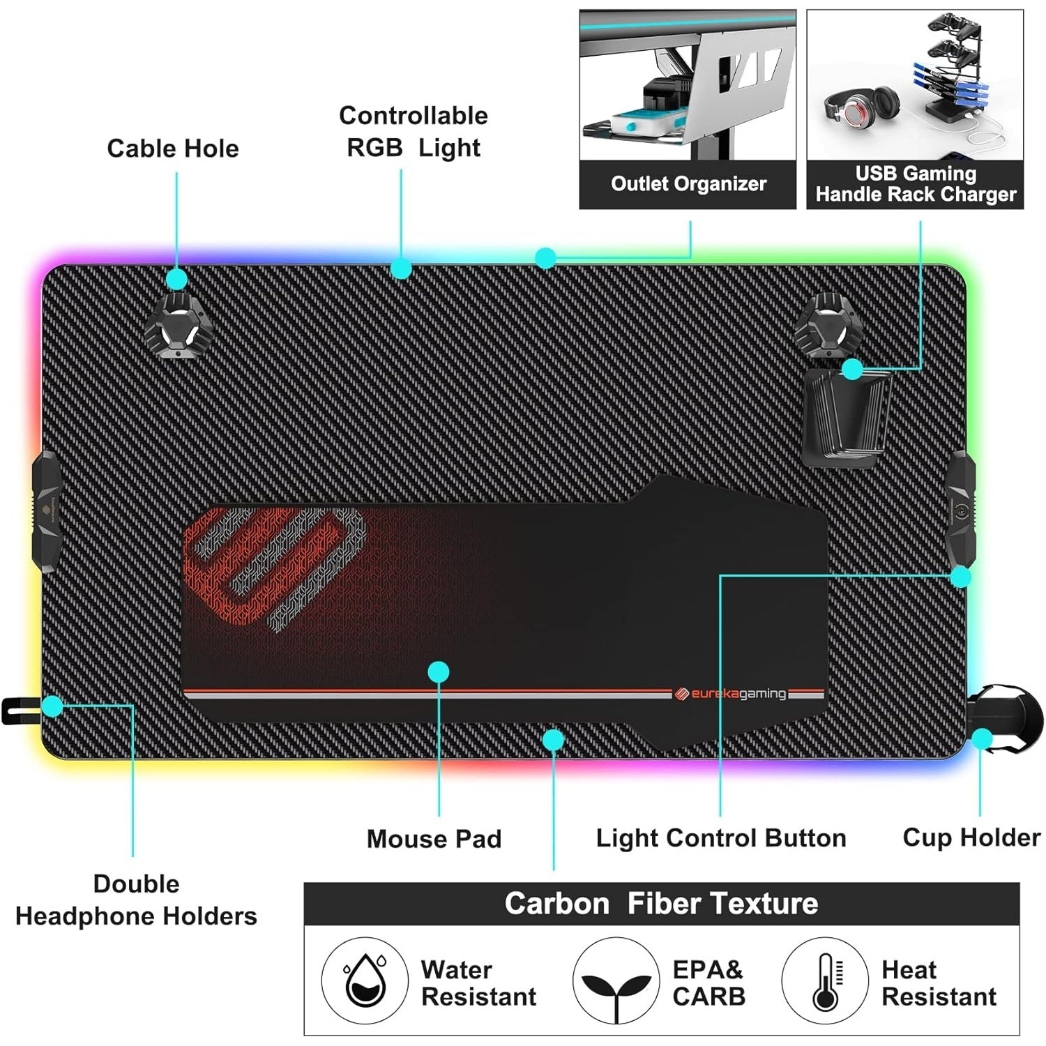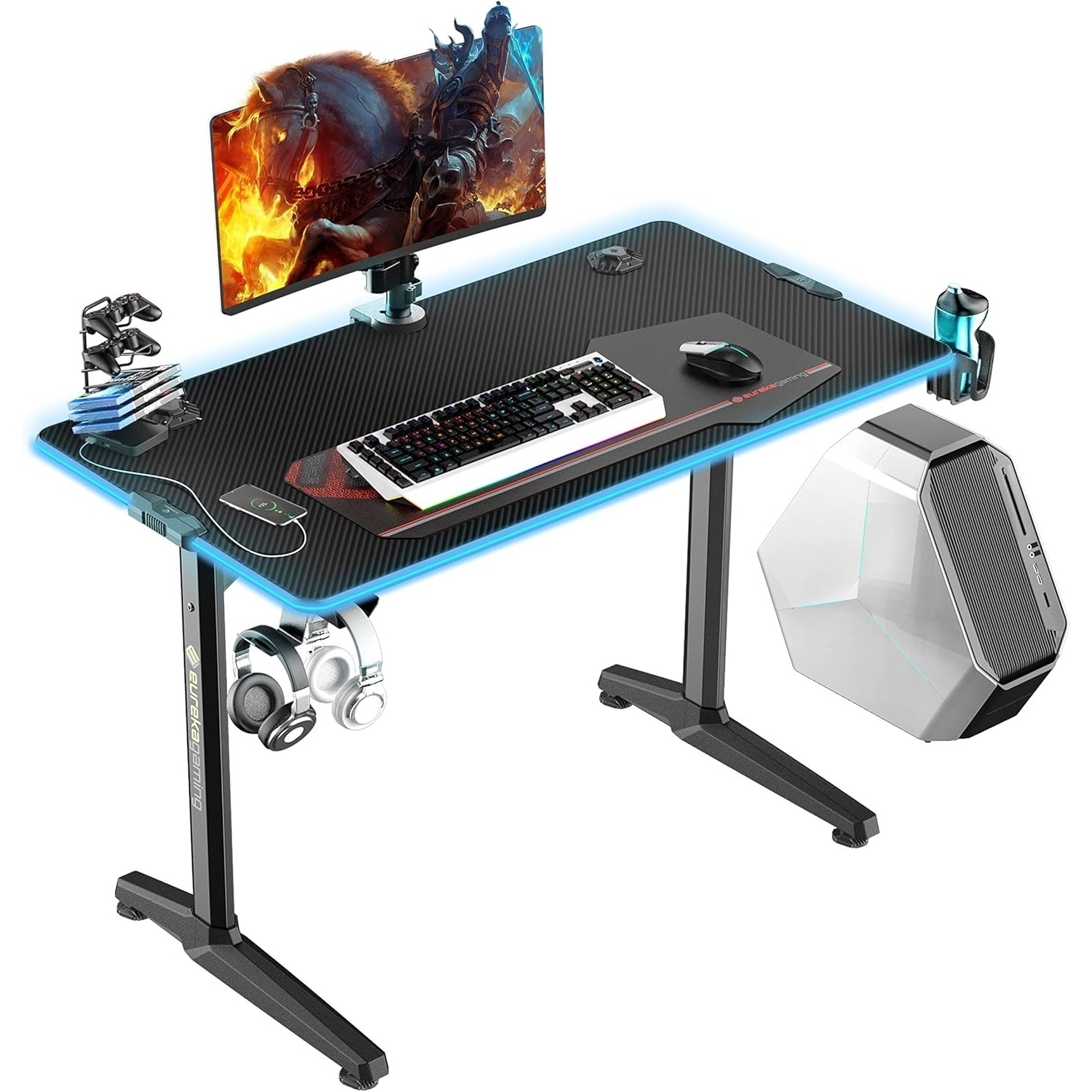 То се предлага с уникален персонализиран дизайн EUREKA ERGONOMIC, стойка за контролер с 4 USB порта за зареждане на мобилни телефони, iPad или слушалки, поставка за чаши и двойни куки за слушалки, които държат напитките и слушалките ви лесно достъпни, двойни отвори за кабели и държач за щепсел.