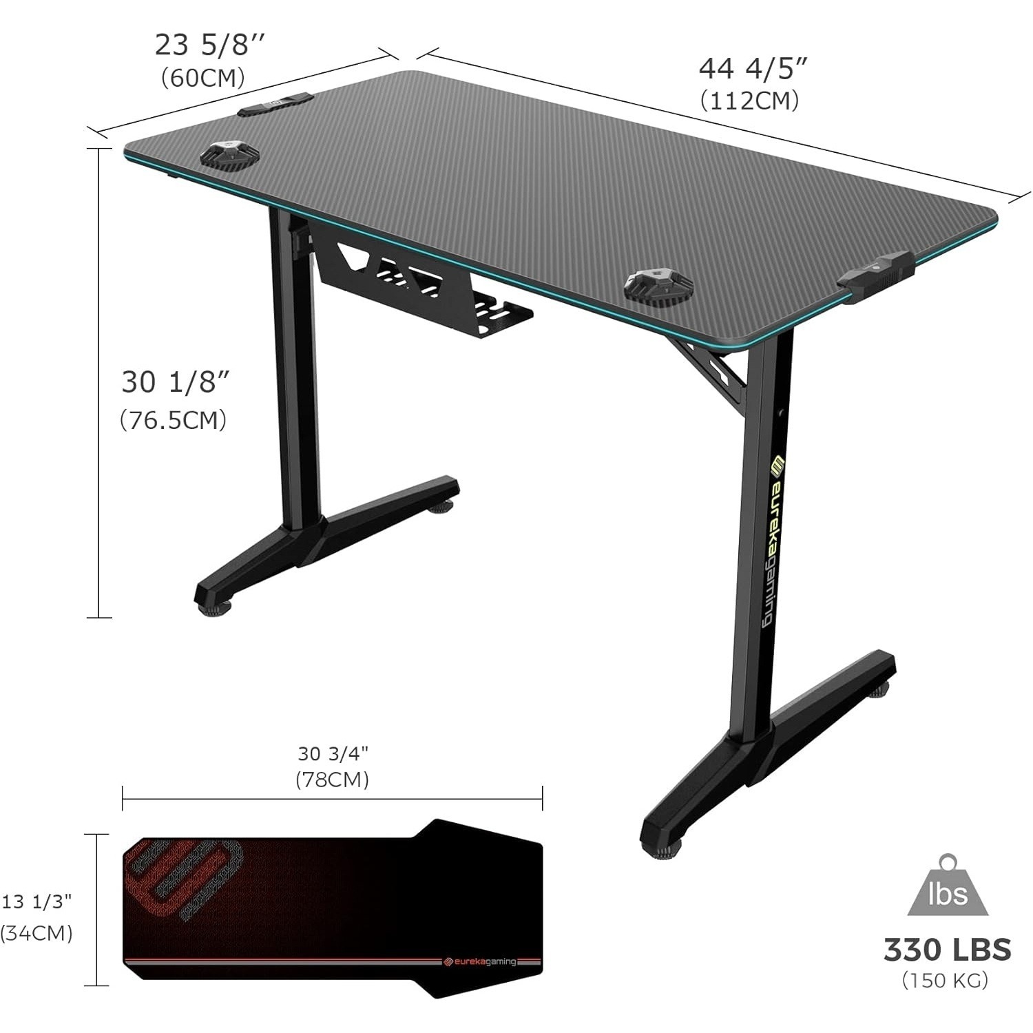 LED геймърското бюро разполага с елегантен, пълнопанелен плот с текстура от въглеродни влакна.