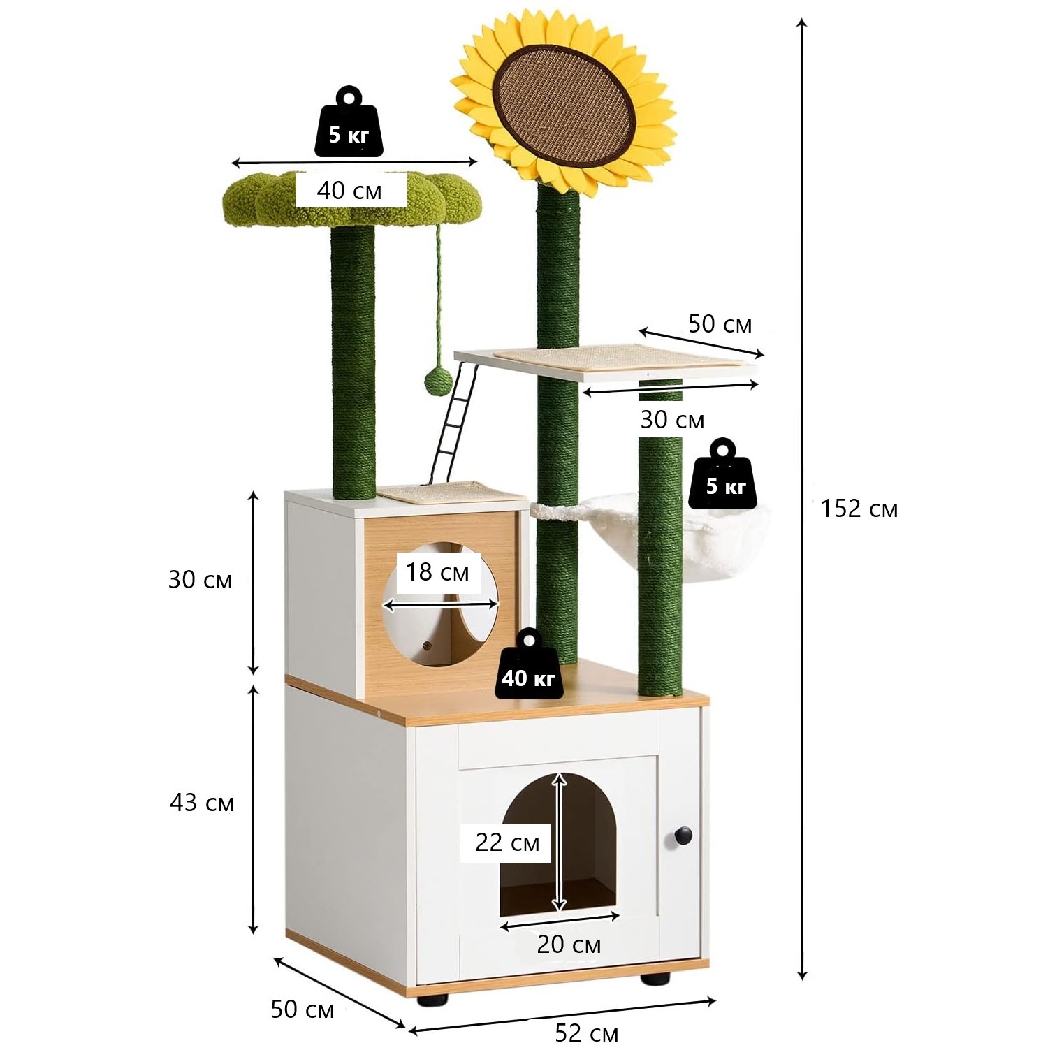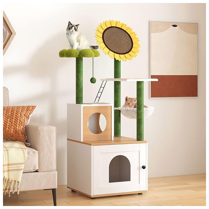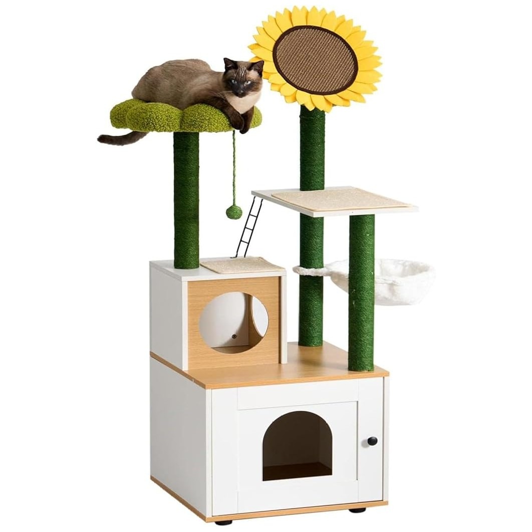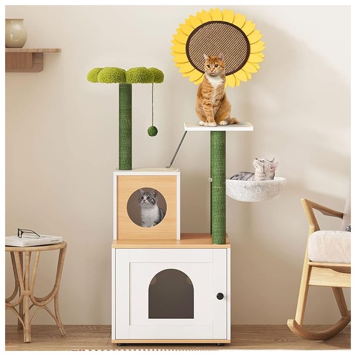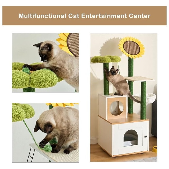 Горната част на двете котешки драскалки е проектирана със зелена плоска подложка с флорална форма, забавна топка за игра и съответно форма на слънчоглед, които могат да привлекат вниманието на вашия любимец.
